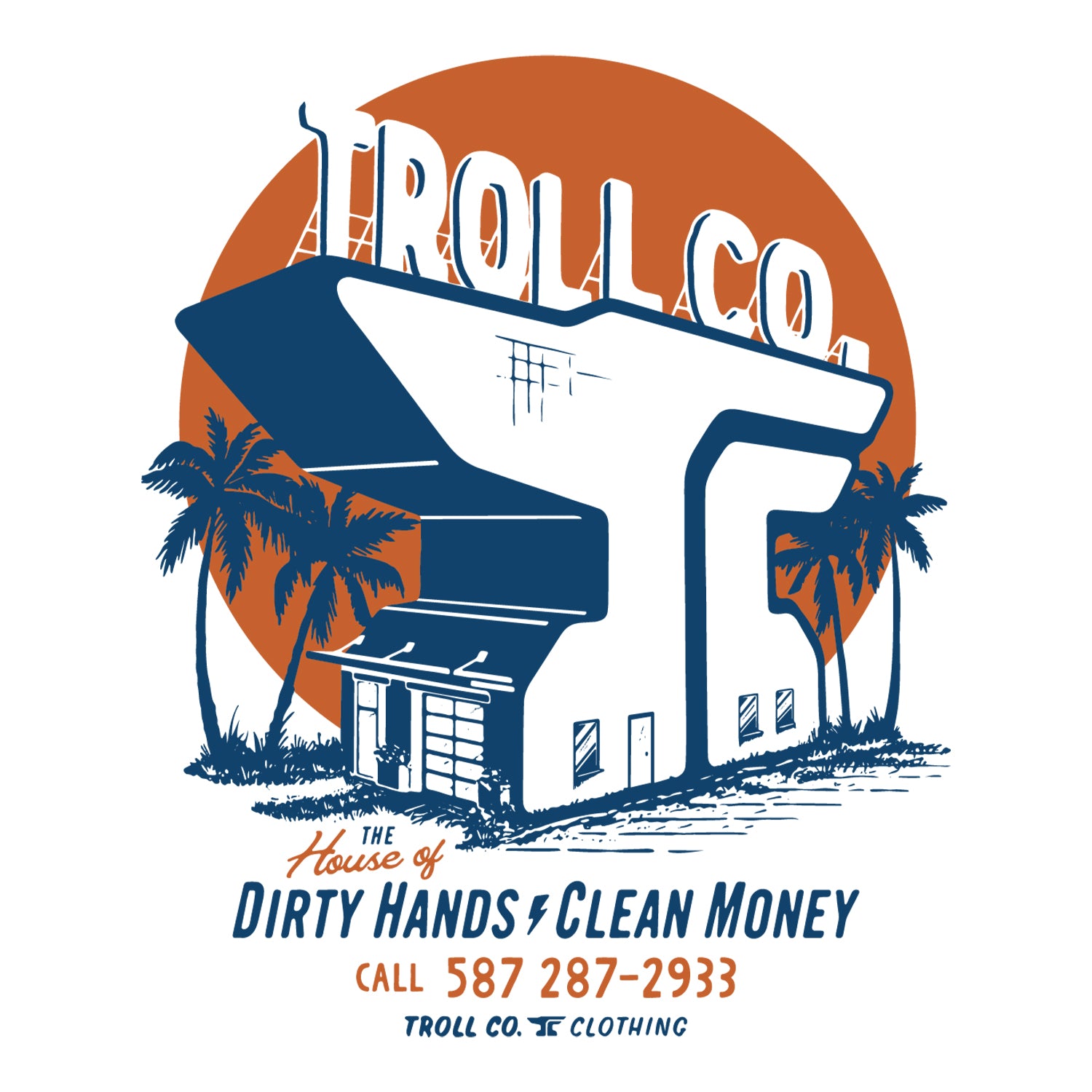 The House of DHCM Tee turns the Troll Co. anvil into a building of its own, complete with block lettering and palm trees on each side. The Dirty Hands Clean Money message anchors the design, calling back to the foundation this brand was built on. It’s simple, solid, and straight to the point.